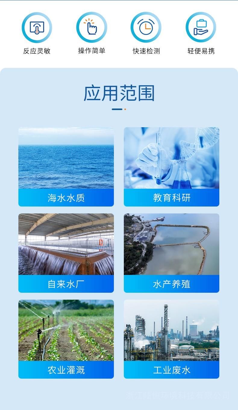 广泛应用于城市供水、食品饮料、环境、医疗、化学、制药、热电、造纸、养殖、生物工程、发酵工艺、纺织印染、石油化工、水处理等领域的水质现场快速检测。